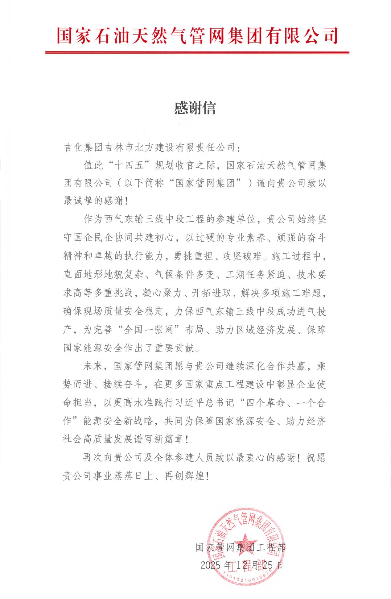 國家石油天然氣管網(wǎng)集團(tuán)公司發(fā)來感謝信