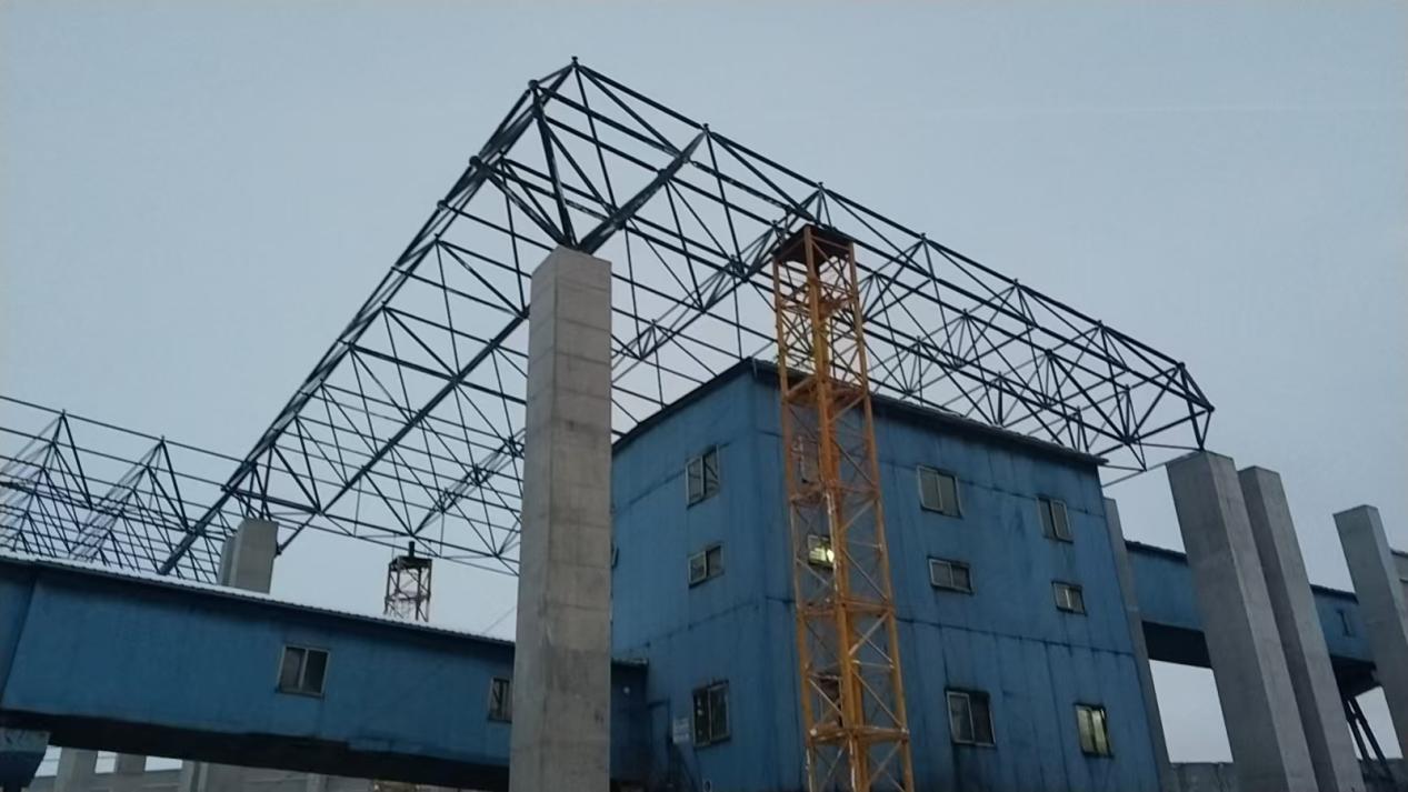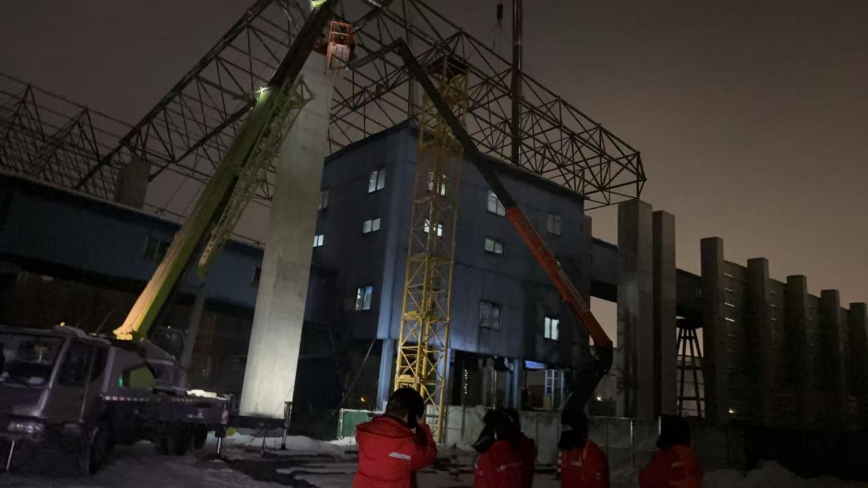 19時,夜幕降臨,氣溫降至零下13℃,高空拼裝正式開啟。項目部啟用1組大功率照明燈配合3臺吊車燈照亮作業(yè)面。4名作業(yè)人員系著雙保險安全帶,登上20米高的網(wǎng)架。寒風(fēng)如刀割般刮在臉上,安全帽、防寒服很快結(jié)上白霜,手套凍得僵硬,連擰螺栓都需要雙手用力夾住扳手。為避免弧度誤差增大,作業(yè)人員連續(xù)奮戰(zhàn)15小時,將網(wǎng)架精準(zhǔn)拼裝至排架柱絞支架上,并通過固定支撐完成永久定位,成功將起拱弧度誤差控制在設(shè)計允許范圍之內(nèi)。